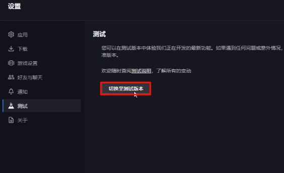 2、在设置菜单中,找到“切换至战网测试版”,然后重启客户端。