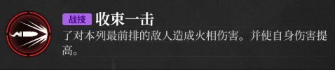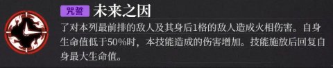 了对本列最前排的敌人及其身后1格的敌人造成火相伤害。自身生命值低于50%时,本技能造成的伤害增加。技能施放后回复自身最大生命值。