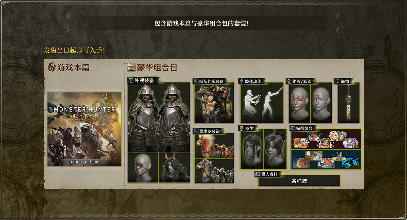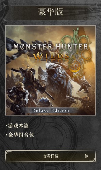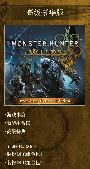 2、高级豪华版提供了游戏的本体、豪华组合包,以及一个高级特典,并且还包括后续怪物猎人荒野的装扮组合DLC1和DLC2。