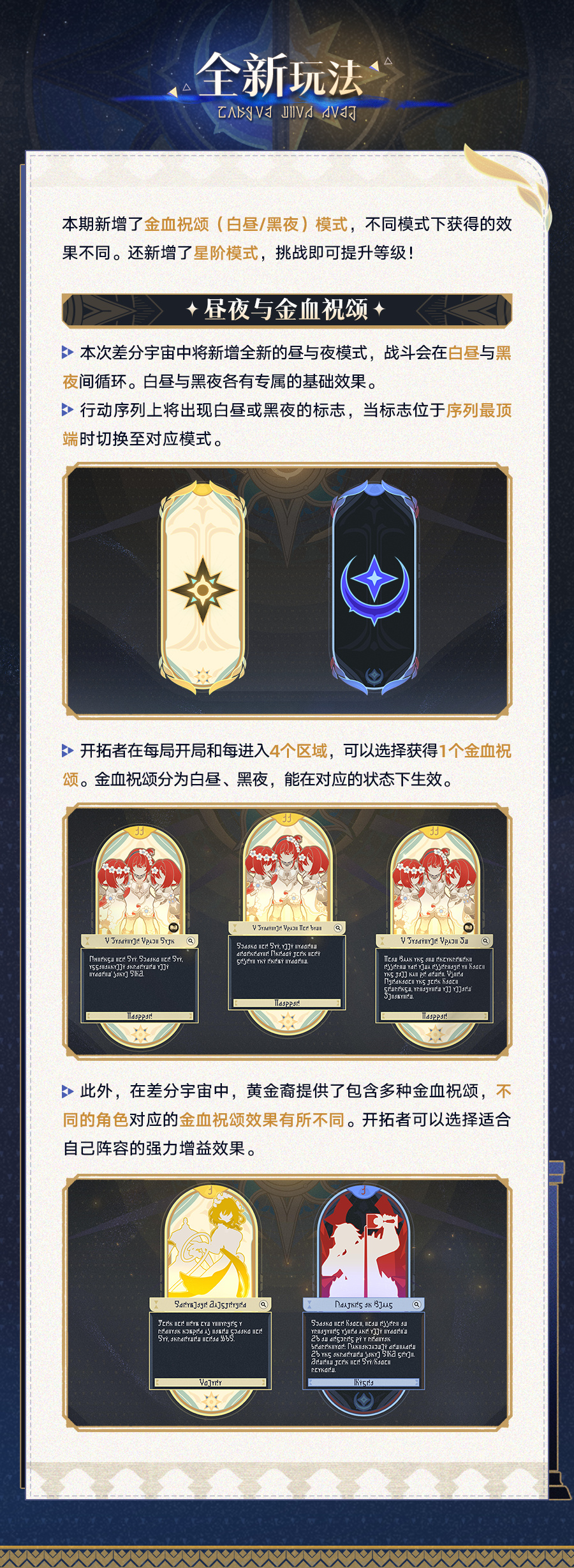 本期新增了金血祝颂(白昼/黑夜)模式,不同模式下获得的效果不同。还新增了星阶模式,挑战即可提升等级!