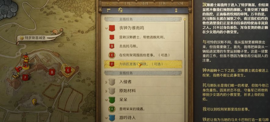 2、按照指示收集所需材料,成功打造马蹄铁并交给铁匠后,你将获得他的信任,并解锁新的任务线索。