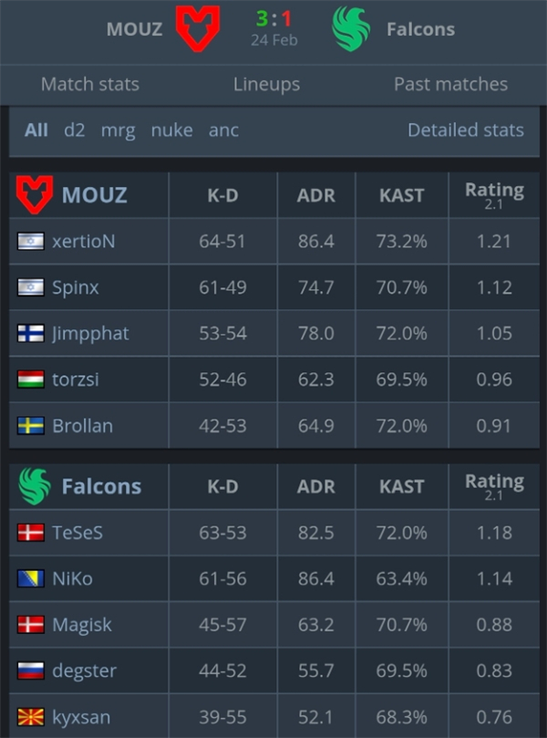 决赛 对阵 MOUZ 的第二张地图(Mirage):他再次打出惊艳数据,获得了 2.16 的 Rating,带领队伍取得关键胜利。