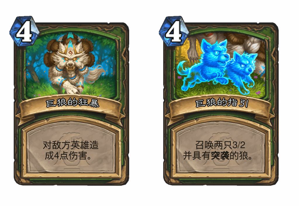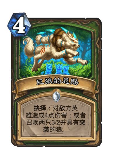 抉择:对敌方英雄造成4点伤害;或者召唤两只3/2并具有突袭的狼。
