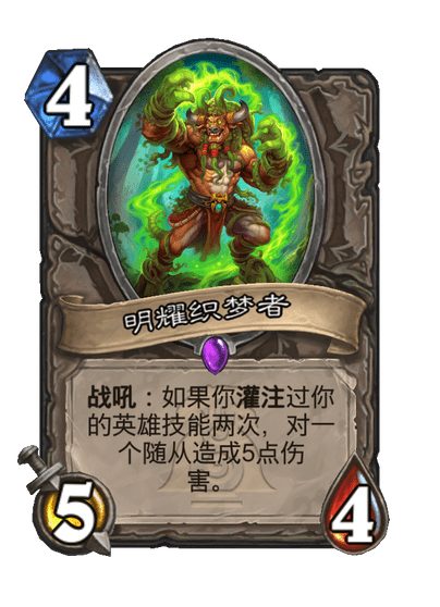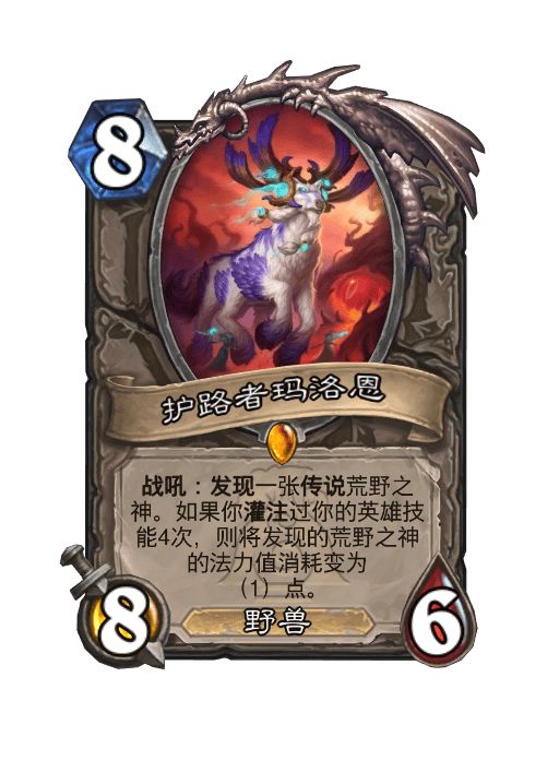 战吼:发现一张传说荒野之神。如果你灌注过你的英雄技能4次,则将发现的荒野之神法力值消耗变为(1)点。
