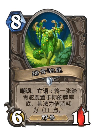 嘲讽。亡语:将一张踏青驼鹿置于你的牌库底,其法力值消耗为(1)点。