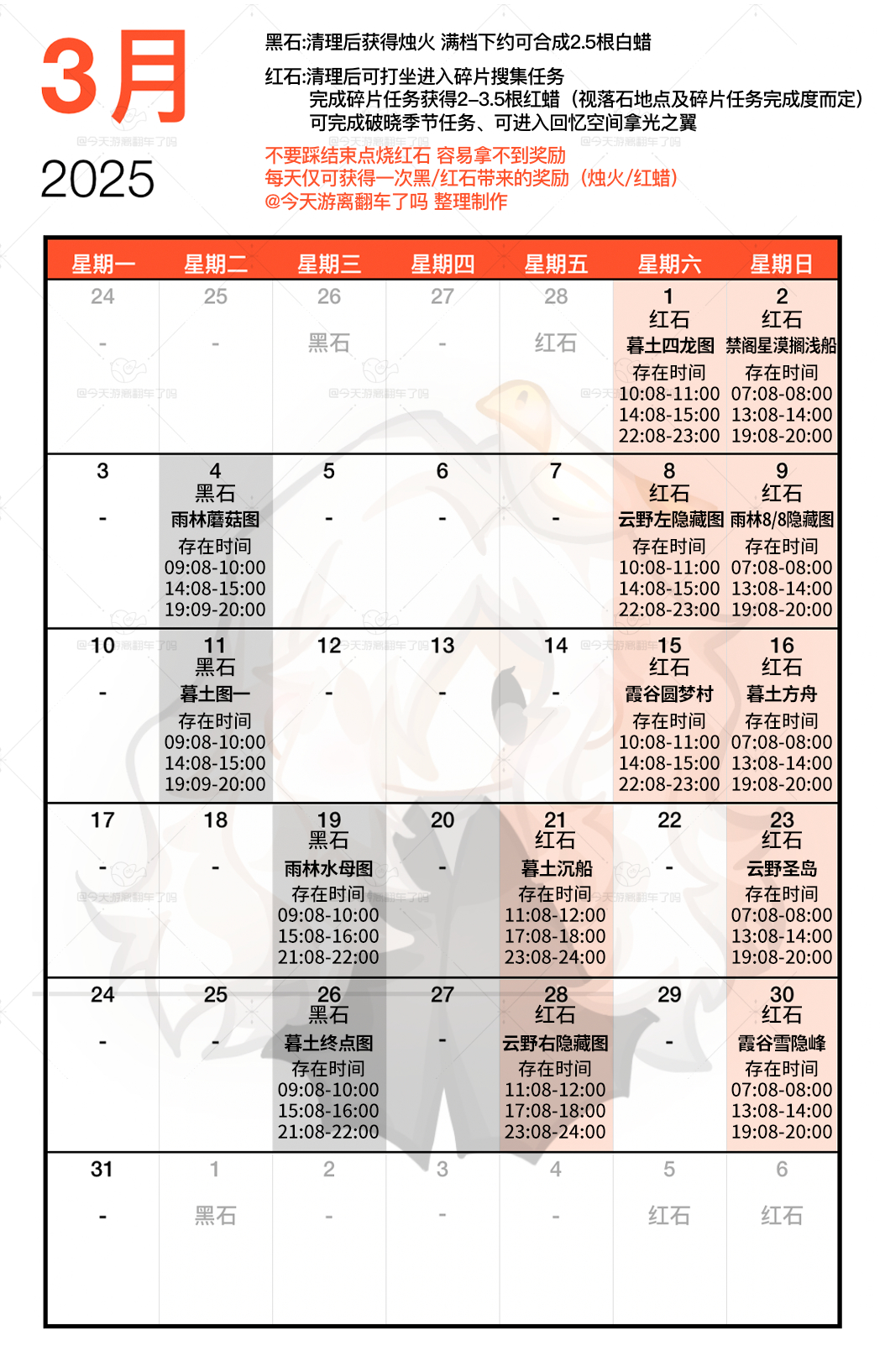 以上就是关于光遇3月红石日历2025的全部内容了,各位玩家们在烧红石或红石都时候,都要注意自身能量的状况哦,小心掉翼啦~