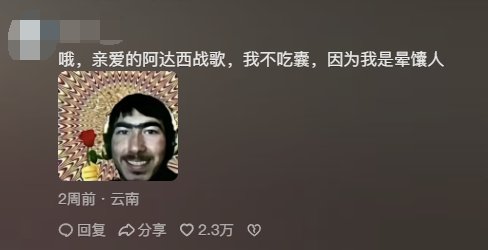 当然最引人注目的还是图片里那个广为流传的形象,如果说原视频有10分的搞笑程度,那么加上这个魔性的表情搞笑程度直接再加100分,大规模的传播也不禁让人好奇:这个一字眉老哥究竟是谁?我也是被这些视频勾起了好奇心,后来一查才知道,这张脸是出自博主阿达西战歌。