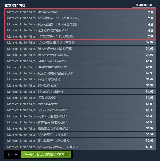 在游戏的DLC列表中,可以看到有多项免费内容,其中包括: