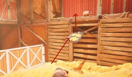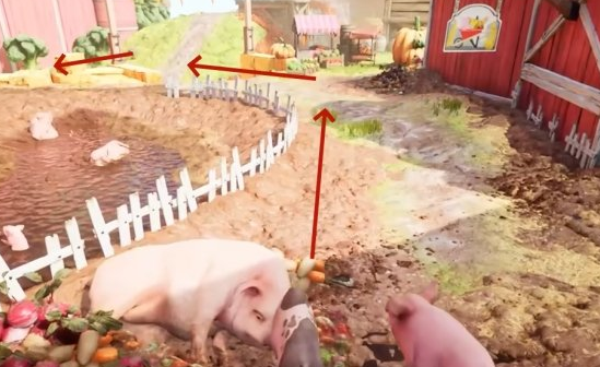 走出大门后红苹果的位置在左边的干草堆上,需要两个小猪配合才能拿到。