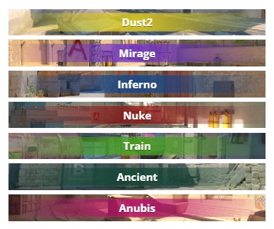 Dust2、Mirage、Inferno、Nuke、Train、Ancient、Anubis