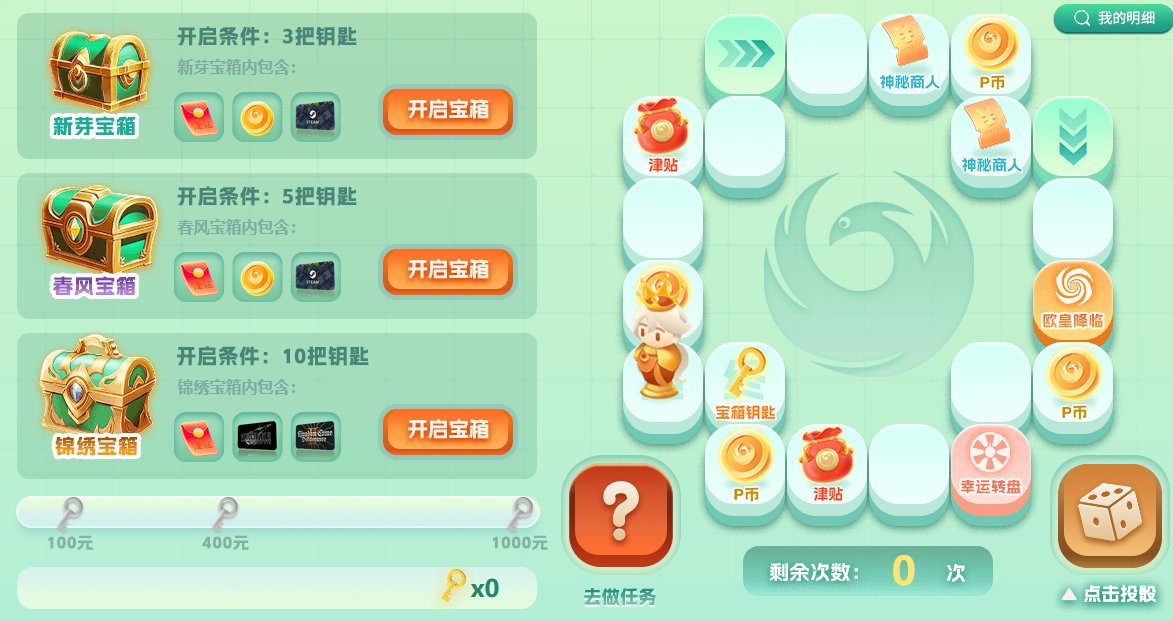 在3月11日至3月24日的寻宝活动中,通过投掷骰子在地图上前进,收集钥匙开启宝箱,就有机会赢取购物津贴、P币和游戏激活码等丰厚奖励。完成每日签到、好友助力等多种方式即可获取投掷筛子的机会。