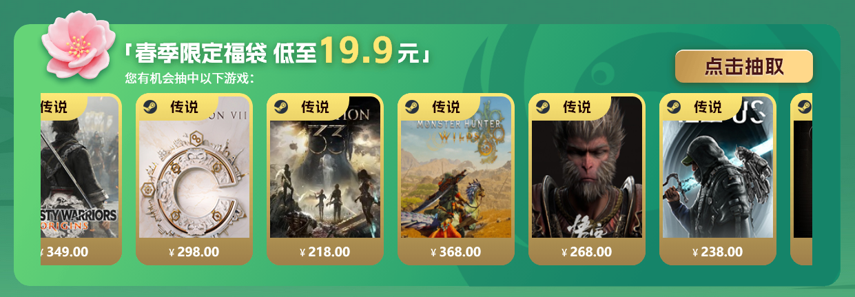 在活动期间,19.99元即可有机会抽取《光与影:33号远征队》、《黑神话:悟空》、《文明7》、《怪物猎人:荒野》、《双点博物馆》《绝地潜兵2》等大作。