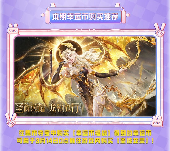 在集市夺宝中购买【幸运币福袋】得到的幸运币,可用于3月14日0点前往和平精英游戏内购买【圣域龙灵】以及其他神装、载具皮肤等。
