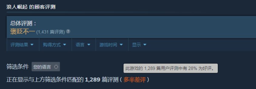 由忍者组制作的幕末题材动作游戏《浪人崛起》,在本周二结束了索尼PS的一年独占,正式登录了Steam平台。然而,因为老生常谈的性能优化问题,游戏口碑大翻车,简中语言的好评率甚至只有28%!
