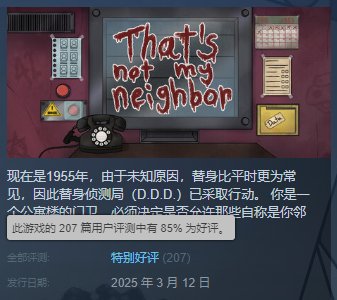伪人题材的找不同游戏《那不是我的邻居》现已在Steam平台发售,国区首发优惠打六折仅需9元,还支持中文语言。目前本作在Steam的好评率为85%,处于“特别好评”。游戏中,玩家将扮演公寓楼的门卫,利用租户的文件信息,仔细判断眼前的申请者是不是伪人。