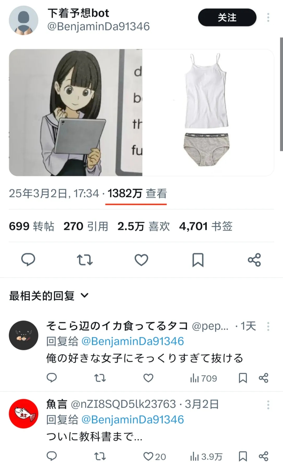 而前几天,日推上也有条关于“英语课”的推文大火,阅读达到了夸张的1300万。但日本人的关注点却是:教科书上的妹子与她的内在服饰.....