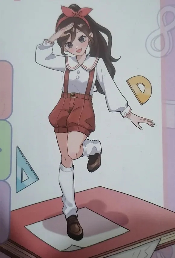 这个梳着高马尾、身穿小白衬衫+背带裤(警觉)、中筒白色堆堆袜+小皮鞋,的小女孩就是锐锐,她出自云南美术出版社的小学教辅书【爱数学】