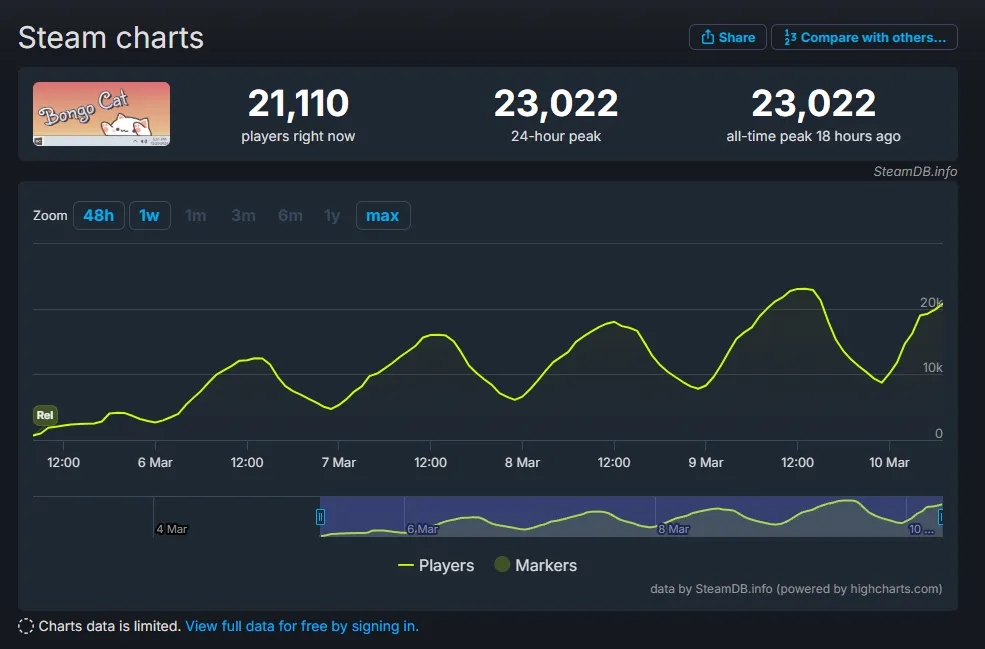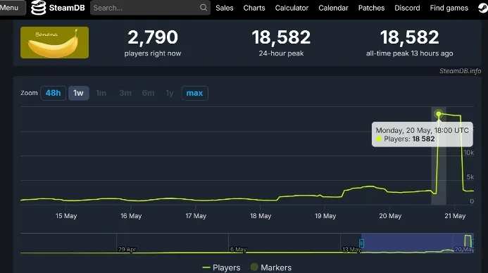 根据steamdb的数据显示,游戏自3月5日发布以来,还没到一个星期就有23000名玩家(或者社畜)同时在线,而且这股势头还一直在保持稳定向上的正增长频率,作为一款新游来说,这个初始成绩算是相当不错的了,比去年刚刚展露出爆火势头的《Banana》还要高。