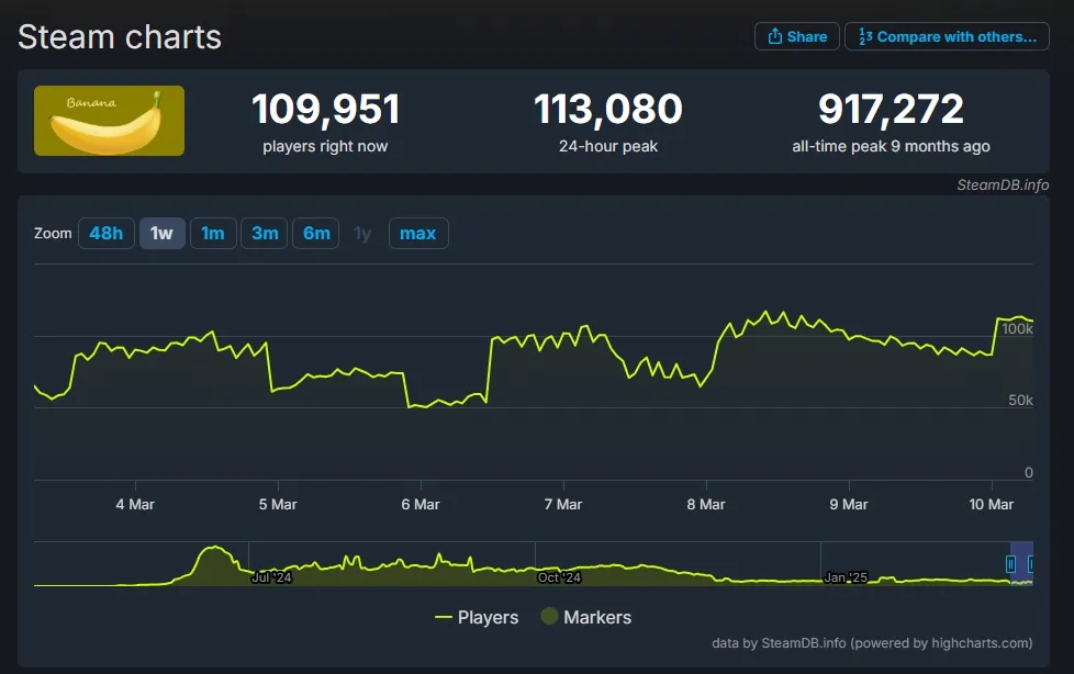 当初很多人都在预测《Banana》可能会因为市场崩盘而销声匿迹,结果却是人家不仅没有消失,人气反而还暴增了数十倍,我也是顺手查了一下才知道它的在线人数究竟有多恐怖。