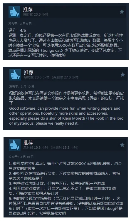 和《Banana》那种只能用鼠标点击来计数的方式相比,邦戈猫可能具备更广泛的实际意义,虽然我并不指望箱子里的东西能卖出一个好价钱,但是这种能在工作过程中体验到类似开盲盒的惊喜感,确实会让上班时的心情好了不少呢。而且从steam评论区来看,大家伙用的时间还真不算少,除了一些小bug,好评里所述的想法几乎是差不多的。