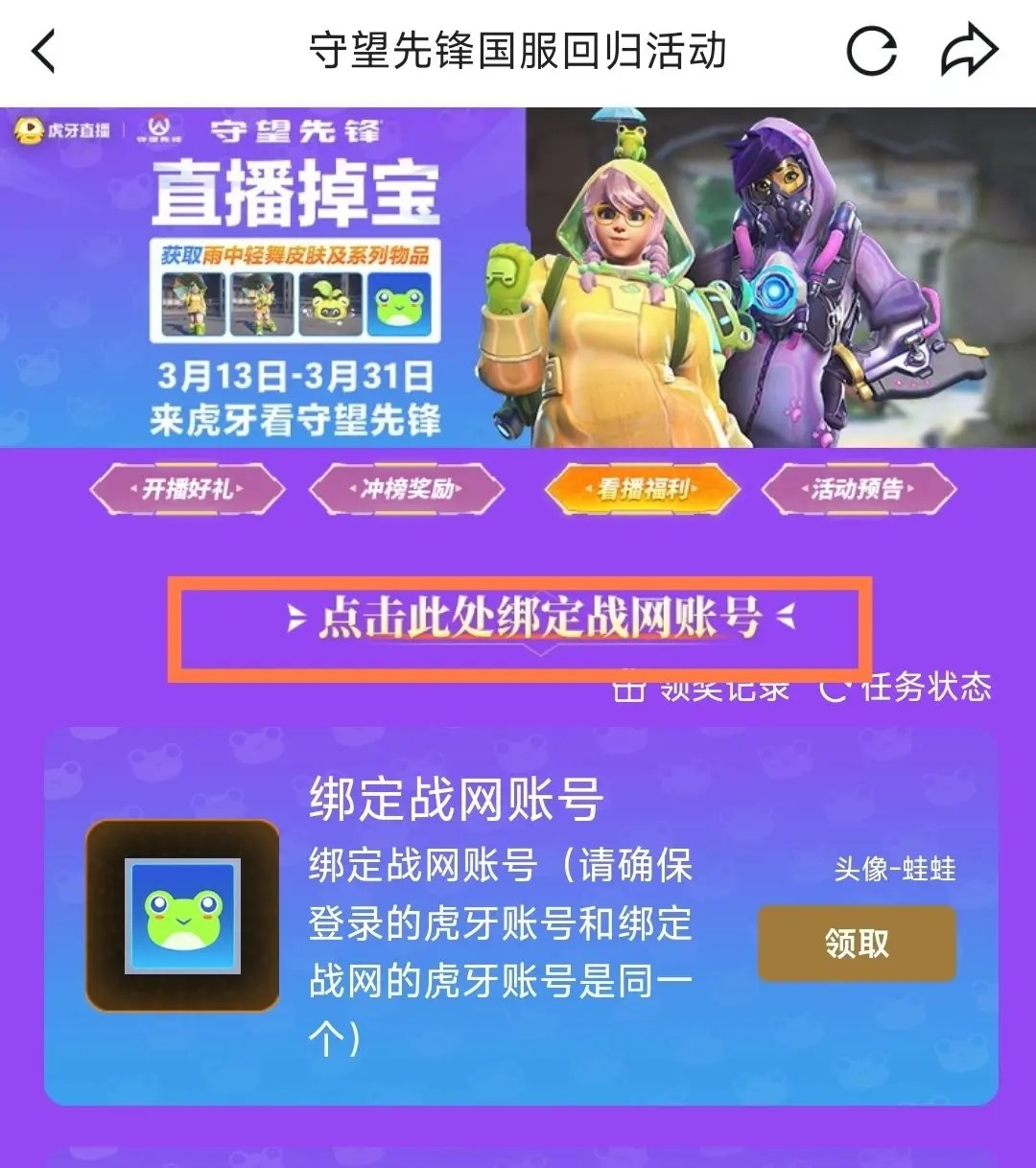 >进入活动页面后,点击“此处绑定战网账号”,完成绑定操作。