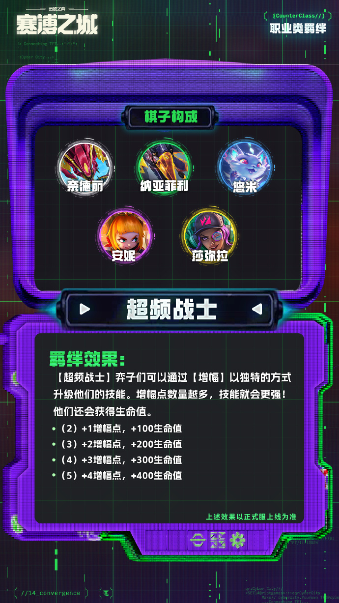 【超频战士】弈子们可以通过【增幅】以独特的方式升级他们的技能。增幅点数量越多,技能就会更强!他们还会获得生命值。