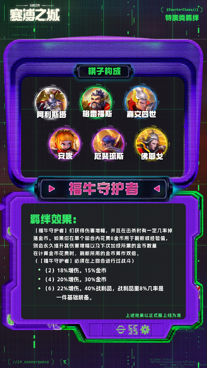 【福牛守护者】们获得伤害增幅,并且在击杀时有一定几率掉落金币。如果你在单个回合内花费8金币用于刷新或经验值,则会永久提升其伤害增幅以及下次加成所需的金币数量在计算金币花费时,刷新所用的金币算作双倍