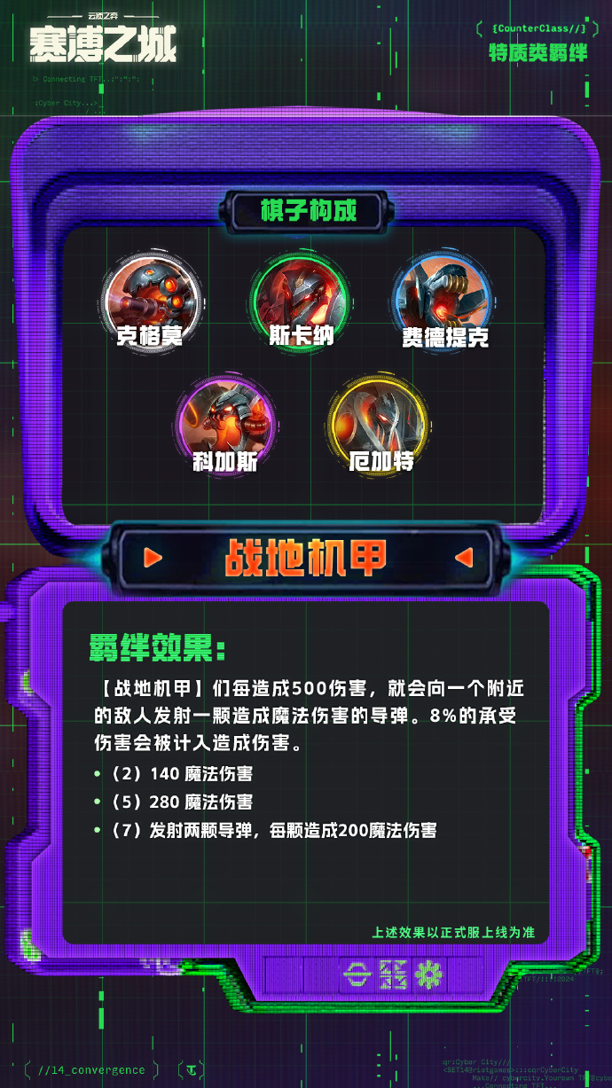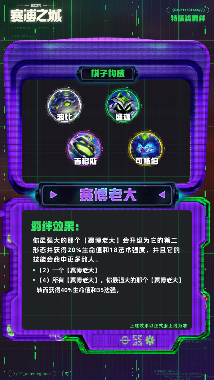 ·(4)所有【赛博老大】。你最强大的那个【赛博老大】转而获得40%生命值和35法强。