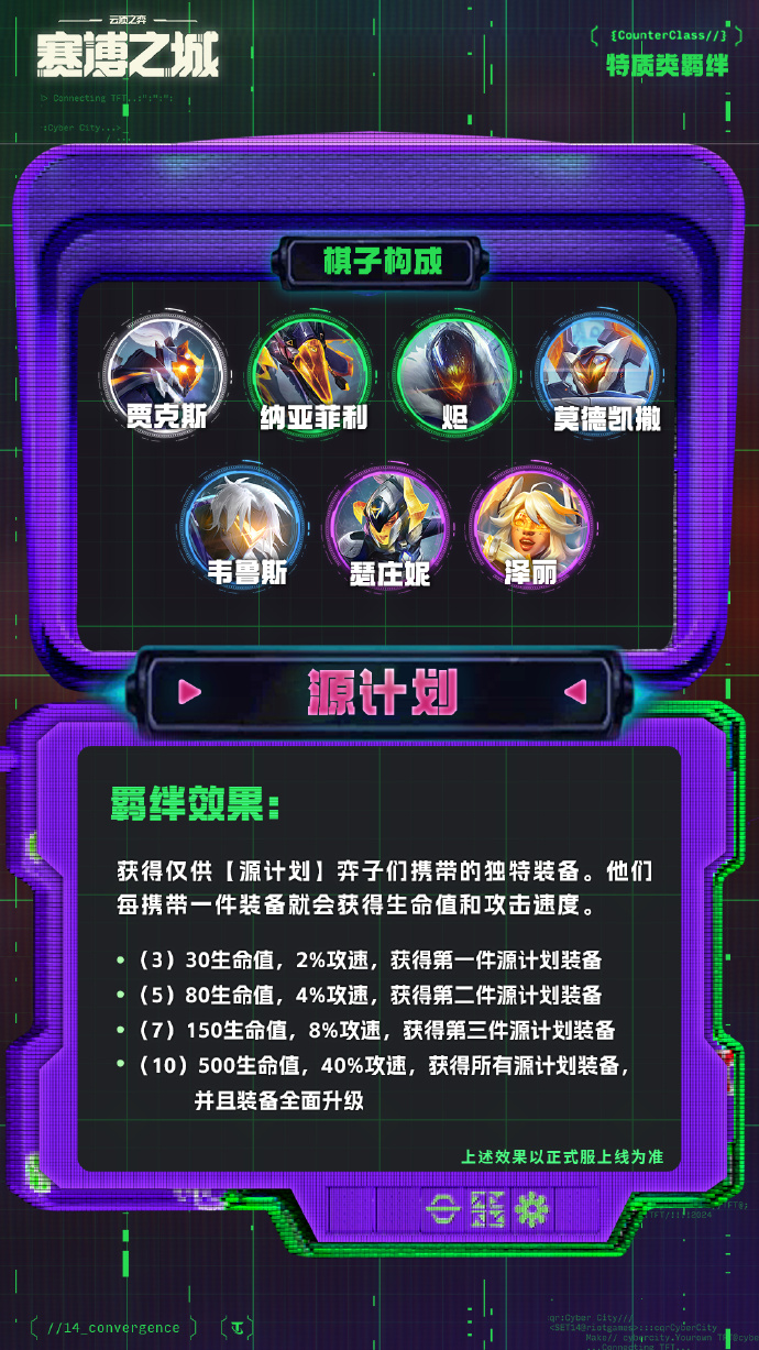 获得仅供【源计划】弈子们携带的独特装备。他们每携带一件装备就会获得生命值和攻击速度。