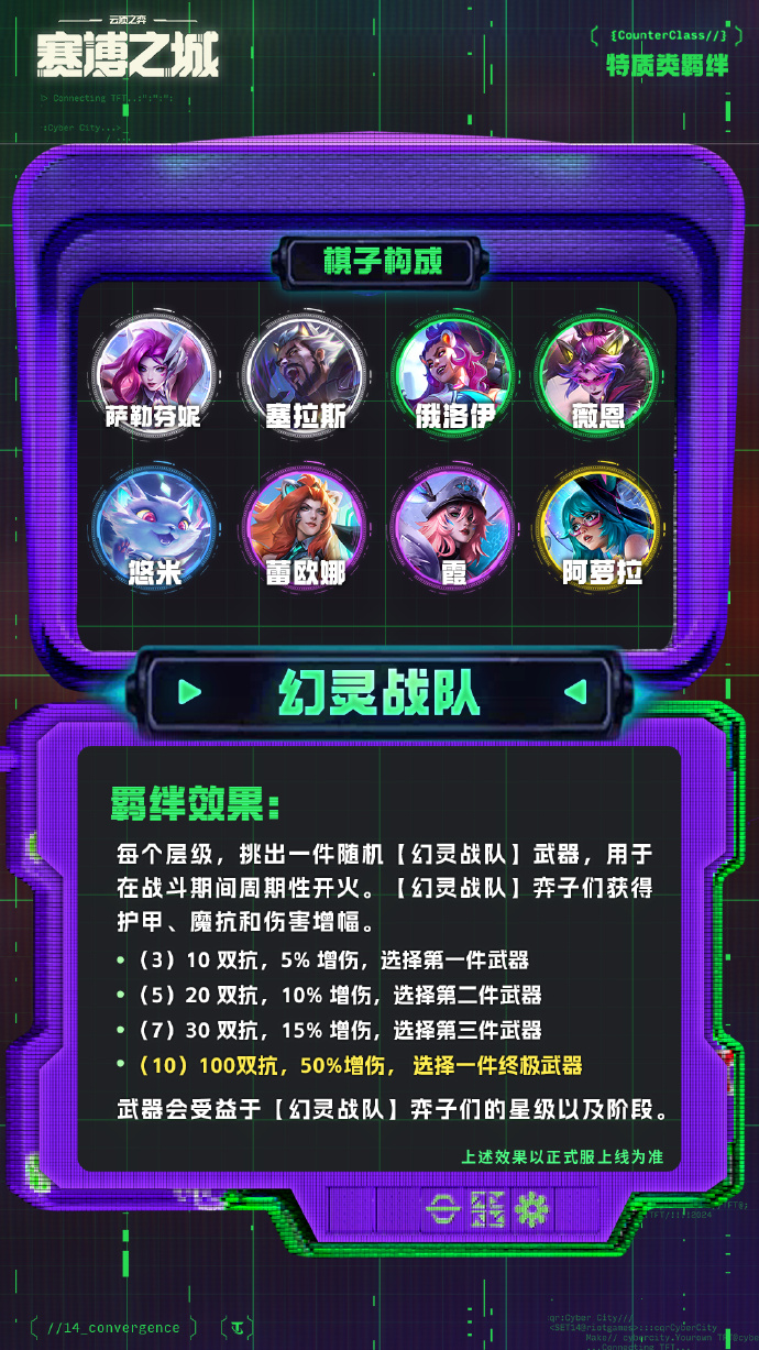 每个层级,挑出一件随机【幻灵战队】武器,用于在战斗期间周期性开火。【幻灵战队】弈子们获得护甲、魔抗和伤害增幅。