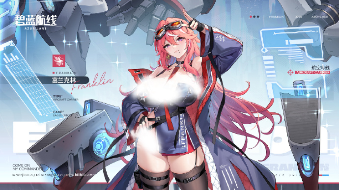 本次即将实装的是SSR稀有度级别的航空母舰「富兰克林」参上!具体的介绍语为:“……护目镜么?我改良过的,各种环境下都能派上用场哦~……比如说?嗯……比如说现在这种‘引起指挥官注意’的场合~”