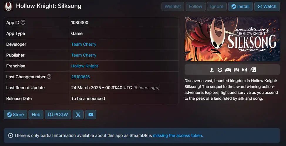 大的要来了?迟迟不发的类银河城游戏《空洞骑士:丝之歌》在今天更新了Steam页面。首先是游戏确认加入GeForce Now,允许玩家通过云游戏来体验,其次是增加了资源库资产,但没有包含新的图片,或许是为将来的更新与优化做准备,最后,官方将版权声明从本作公布时的©2019变更为©2025,或许代表着游戏在今年会有新动向。让我们拭目以待吧!