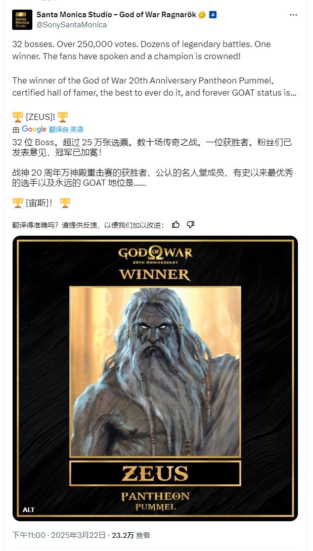 为庆祝《战神》20周年,圣莫妮卡工作室在近期举行了人气Boss投票活动。本次投票活动汇聚了系列历代作品中32位最具代表性的Boss角色,收集到了超过25万张选票。在经过数轮的角逐后,宙斯在最终的神王决战中,以82.6%的压倒性优势击败了奥丁(17.4%),荣登“战神人气Boss”的宝座。不知这个结果是否和你的预期一致呢?