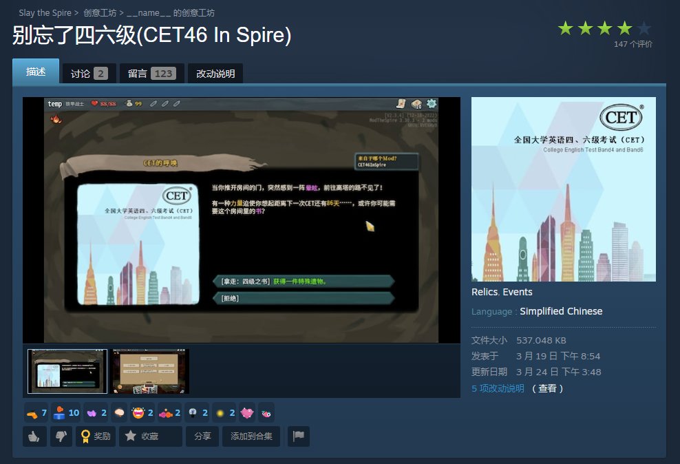 知识就是力量啊!就在最近,《杀戮尖塔》的创意工坊新上架了一个“别忘了四六级”mod,几天时间就直接干到了热门第一。老猫也试玩了一下,可以看到,安装mod后,游戏开局会让玩家选择背4级还是6级单词,然后就会获得对应的遗物。之后每次出牌都会考你一个单词,如果答对了,就能获得伤害或效果加成。比如这个“无谋冲锋”,能对易伤状态下的敌人造成10点伤害,而玩家选对了2个词义,就能把伤害翻倍,直接秒掉这个19血的怪物!你还别说,感觉还挺有意思的。关注猫修,带你了解最新游戏资讯!