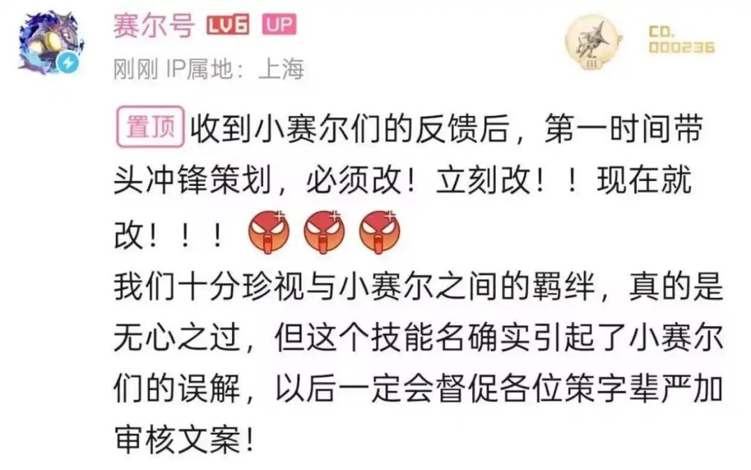 证据就是去年“旭策往精灵技能里夹杂私货,像女神表白”那事,这至少可以说明,赛尔号这游戏完全没有审核。你说此次谐音梗阴阳玩家这事,是官方集体行为,我觉得可能性不大。但你要说是某个策划的个人行为,因为审核几乎等于没有,导致出了这么个花活,那我觉得还是非常有可能的。