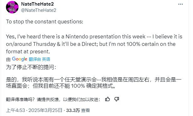 就在今天,舅舅党 NateTheHate 发文爆料,任天堂会在本周内举行新一期直面会,时间很可能是周四左右。而这次和4月2日的Switch2直面会不同,只会专注于介绍Switch的相关内容。不过他也表示“目前我还不能 100% 确定其具体形式。”值得一提的是,该爆料得到了其他舅舅党的支持,外媒Insidergaming同样报道了此事,并询问了任天堂,但对方不愿对网络传言发表评论。咱们还是拭目以待吧!