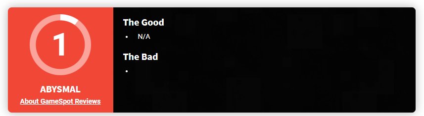 而你要问这游戏究竟有多烂?就这么说吧,在20多年前,游戏媒体还象征着权威的年代,这款游戏在GameSpot上的评分仅为1分(满分10分),M站上更是只有低到离谱的8分(满分100分)。