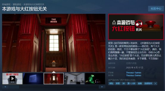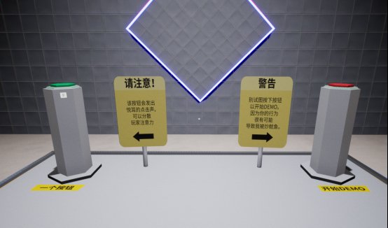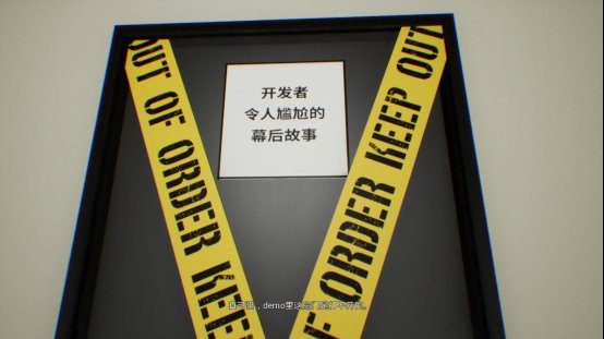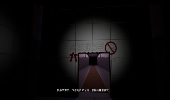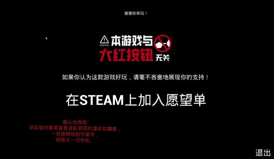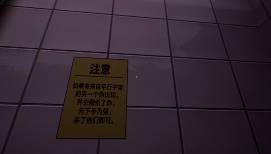 虽然demo的关卡非常少,玩法说起来也十分匮乏,甚至往严重了说就是单纯的无聊,但是我有理由相信,游戏制作者想表达的东西一定不会这么肤浅,首先在游戏一开始,创造者就向我们阐明了大红按钮的危害性,简单来说就是这个按钮会导致多元宇宙的事件发生,在第一个转角的走廊上也能看到类似的警告,至少说明在正式版中,平行宇宙的我们也会成为游戏的一部分。