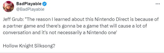 至于这款游戏具体是什么,虽然他没有透露,但玩家们已经开始了猜测,《女神异闻录4 重制版》《空洞骑士:丝之歌》甚至还有《血源:诅咒》。只能说,大伙确实是望眼欲穿啊!