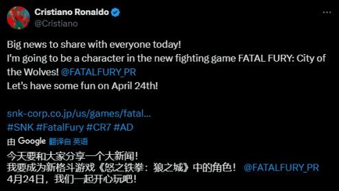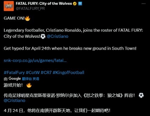 这真的不是什么愚人节的笑话,C罗本人以及《饿狼传说》官方都已在社交媒体上证实,他将作为首发阵营的角色登录到游戏当中。