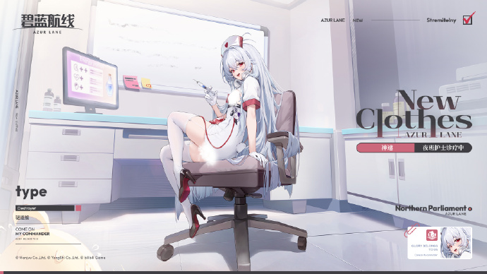 这次的皮肤说实话确实不错,之前的大月卡皮肤弄得都比较一般,不是说质量一般,主要是很多时候皮肤设计得过于保守,符合碧蓝航线主题和风格的清凉款式的皮肤,在大月卡这一块基本上没什么太多的让人有深刻印象的新装推出,而这次的神速的护士装,说实话也算是这次一众护士主题皮肤中,最为保守的了。