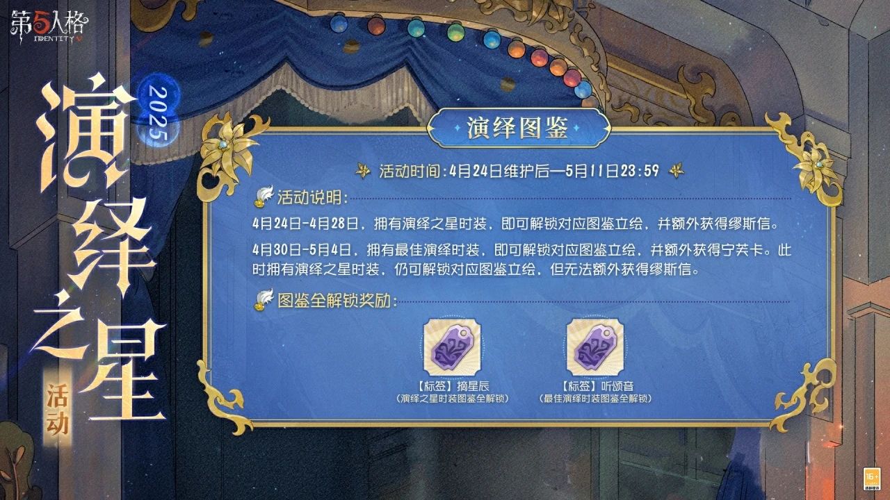 2025演绎之星活动将于4月24日维护后开启,访客们参与活动将获得独特时装解锁卡、动态头像、海报家具、头像框、涂鸦、表情和标签等奖励。