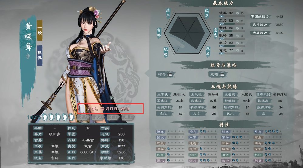 有了这个数据玩家就能计算出每个女武将的排卵期,排卵期的计算方式为月事开始后往后加15天,只要在排卵期期间行房事,受孕的概率就会非常的高,具体到游戏里就是这些女武将会对玩家说出“妾身算着日子,现在那个可能会把肚子闹大的”这样的话。