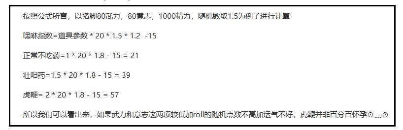 如果真的想保证高受孕率,可以尝试在行房事之前服用“虎鞭”这个大概率能一发入魂的道具,不过这玩意也跟现实差不多,也就是给心里兜个底,一些求知若渴的玩家甚至还动用了代码,推出了一套怀孕概率公式,证明即使是虎鞭也没法做到百分百怀孕。