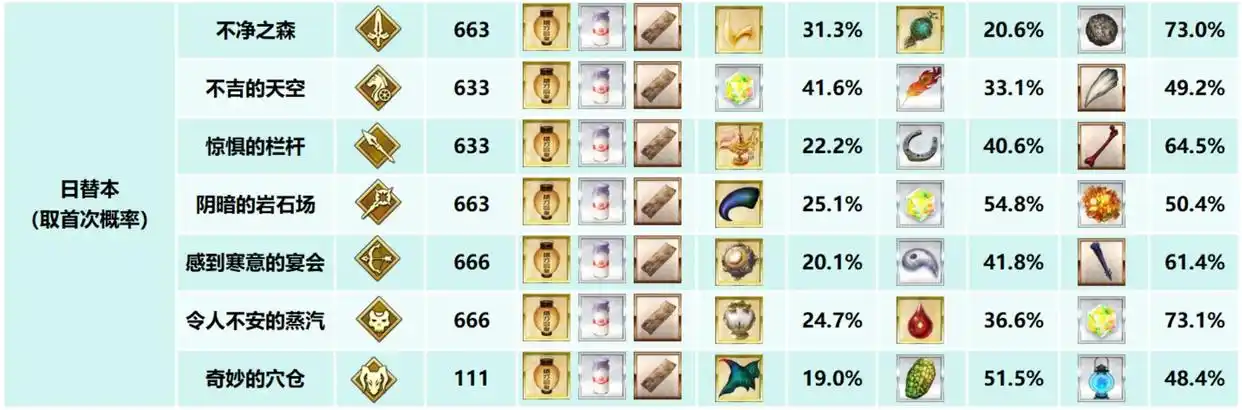 怪异本一共是7个职阶,配置略有不同,以上是各个关卡的配置和掉落情况,需要注意,这些关卡主打牵绊,素材掉率其实比较一般,基本就是靠量堆积起来的。