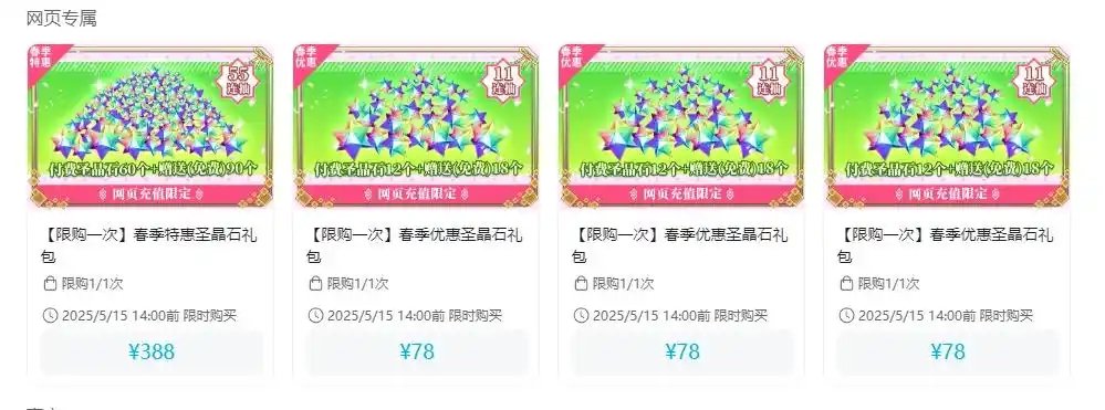 第一种是388可获得60个付费石和90个免费石,一共是150个圣晶石,限购一次。第二种是78可获得12个付费石和18个免费石,一共是30个圣晶石,限购3次,期限是到5月15日下午14:00结束。