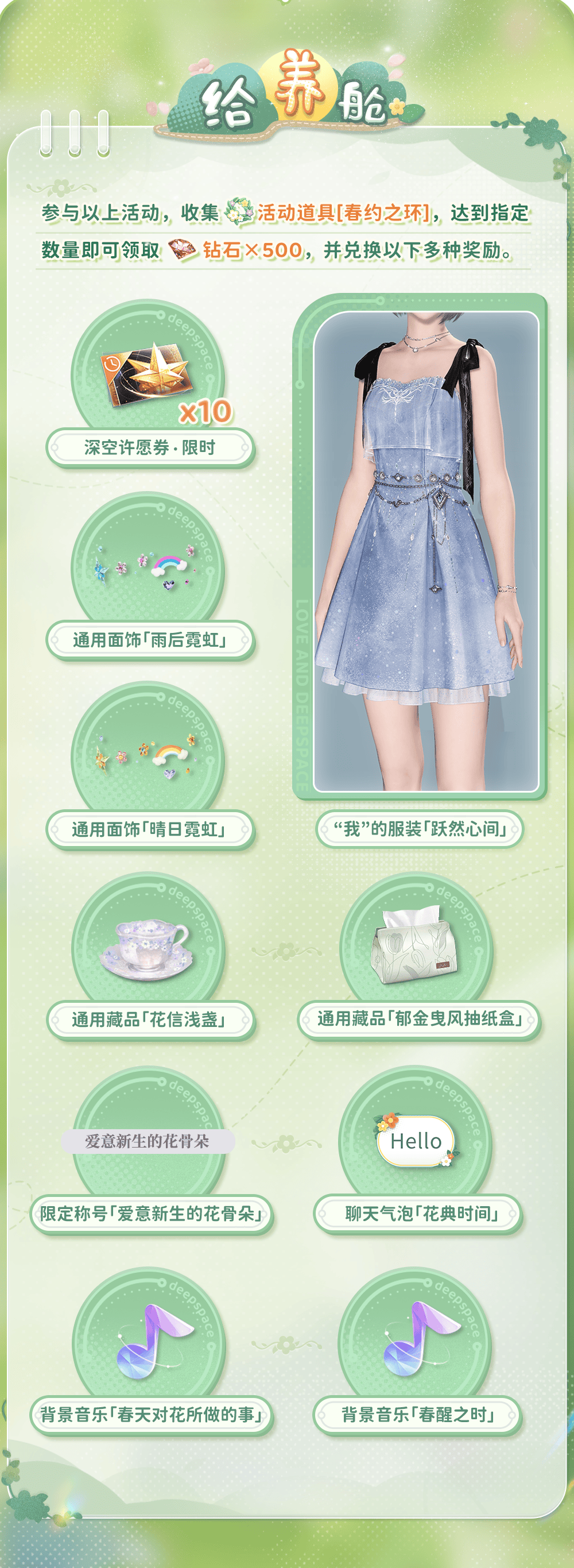参与以上活动,收集活动道具春约之环,达到指定数量即可领取钻石×500,还可兑换深空许愿券·限时×10、“我”的服装「跃然心间」、通用面饰「雨后霓虹」「晴日霓虹」等缤纷好礼!