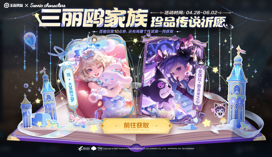 活动简介:使用三丽鸥祈愿币进行祈愿,有概率获得皮肤、天幕、灵宝装扮、三丽鸥兑换币等奖励。使用三丽鸥兑换币可兑换全新珍品传说皮肤等奖励。