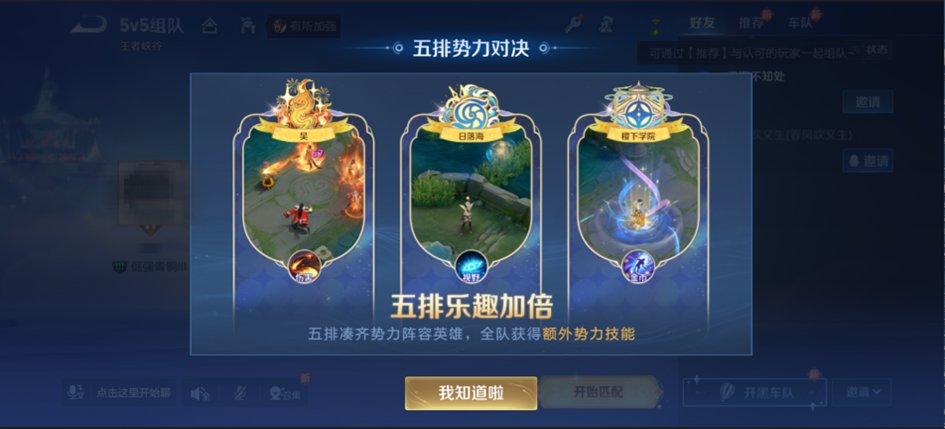 体验方式:该玩法可在组队五排时触发,排位与匹配均可。我方至少选择三名同势力的英雄时,将会激活对应势力技能效果进行对战,