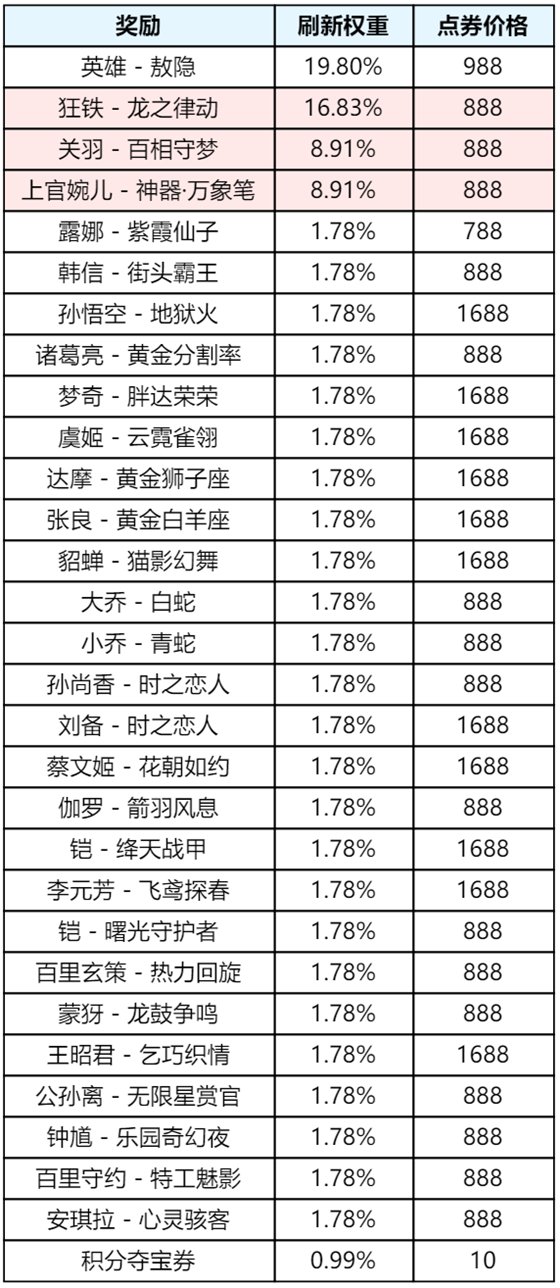 本次更新了2款限定返场皮肤,其余刷新概率、折扣概率均不变,奖励列表详见下方: